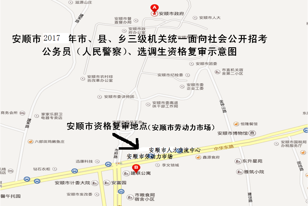 2.报考司法警察职位及其他职位考生,资格复审地点:安顺市劳动力市场(西秀区中华东路金钟广场门口湘南酒店旁)。